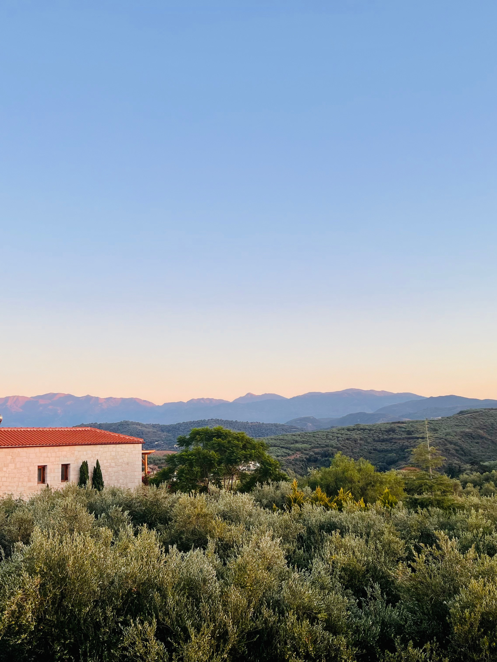 A whitewashed villa drifts through the olive groves of Crete, as if the island dreamed it into being.